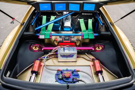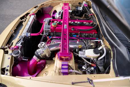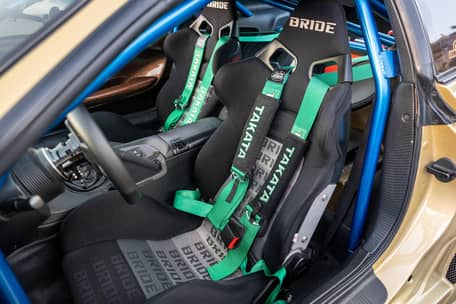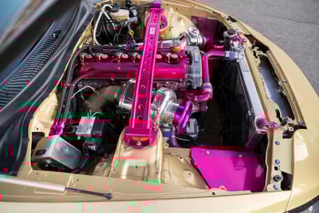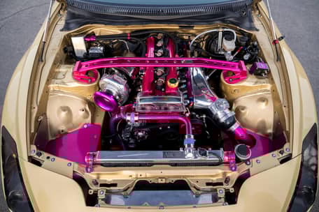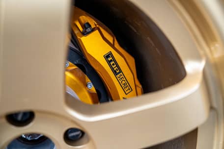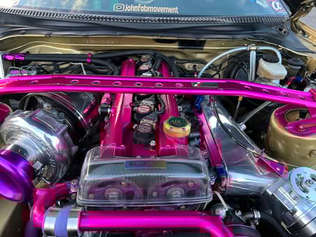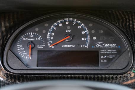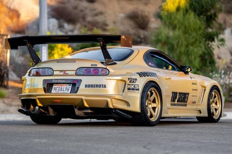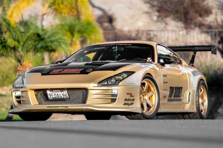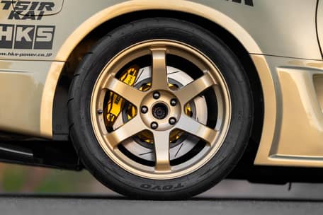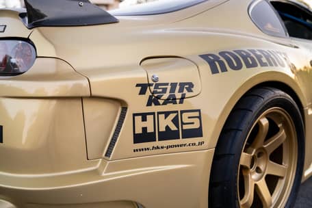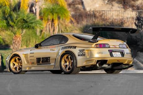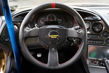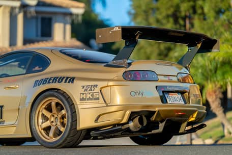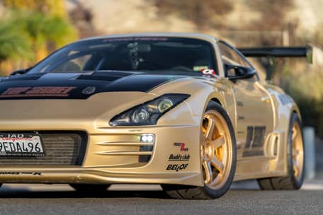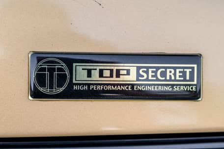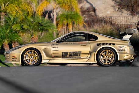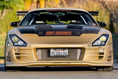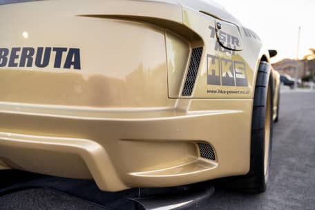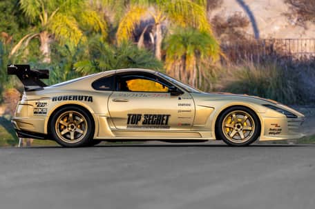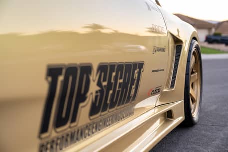 • Modifications reported by the seller are extensive, and the full list is detailed below. Highlights include a custom gold pearl paint job in tribute to Top Secret, a Top Secret final evolution wide body kit, 18-inch Rays TE37 wheels painted gold pearl with Toyo Proxes R888 tires, a HKS 3.4L stroker kit, a HKS T51R SPL ball bearing turbocharger, a Zex nitrous system, an OS Giken triple plate clutch, Aragosta coilover suspension, and a Roberuta adjustable ride height cup kit with remote control.