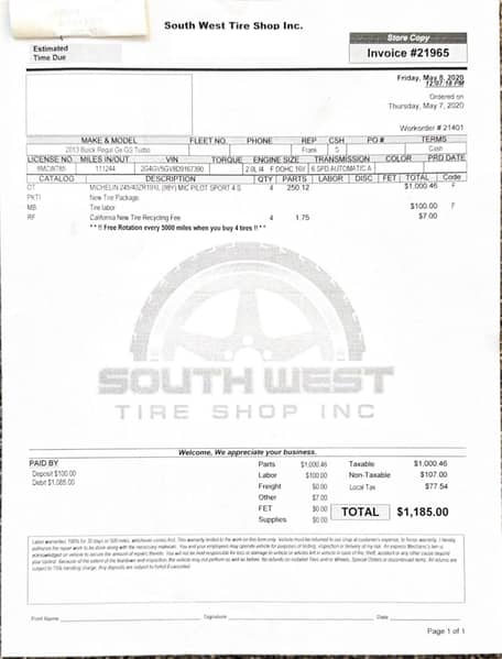 - May 2020 (111,244 miles): Four tires replaced
