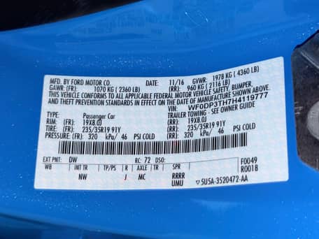 - According to the window sticker provided in the gallery, notable factory equipment includes 19-inch forged wheels, Brembo front brakes, dynamic torque vectoring, Recaro front sport seats, a SYNC3 infotainment system, and a Sony sound system. The seller reports no notable modifications.