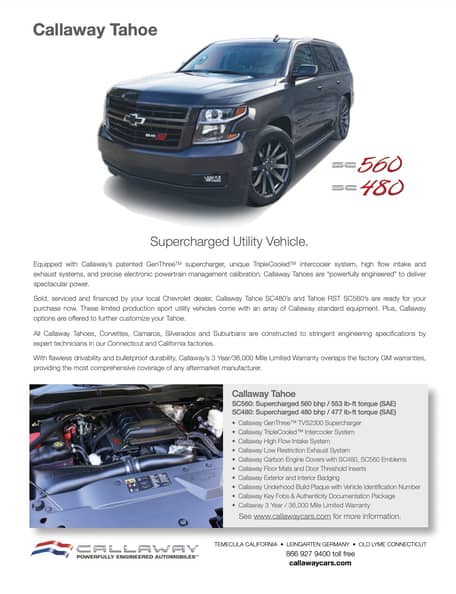 - Callaway SC560 Supercharged Package (GenThree TVS2300 supercharger, TripleCooled intercooler system, Honker high-flow air intake, low restriction exhaust system, carbon valve covers, handling package with magnetic ride control, sport pedal package, Callaway badging, embroidered floor liner package)