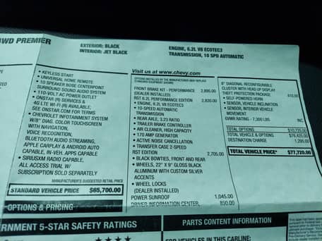 - A window sticker is provided in the photo gallery showing that this Tahoe carried an MSRP of $101,710 when new. A partial list of notable equipment includes the Callaway SC560 Supercharged Package along with the RST Performance Edition and RST Edition trim levels which include 22-inch wheels, a 2-speed transfer case, trailer brake controller, active noise cancellation, and more. Additional equipment includes the Theft Protection Package, performance front brake kit, a sunroof, a Bose surround sound system, and the driver information center.